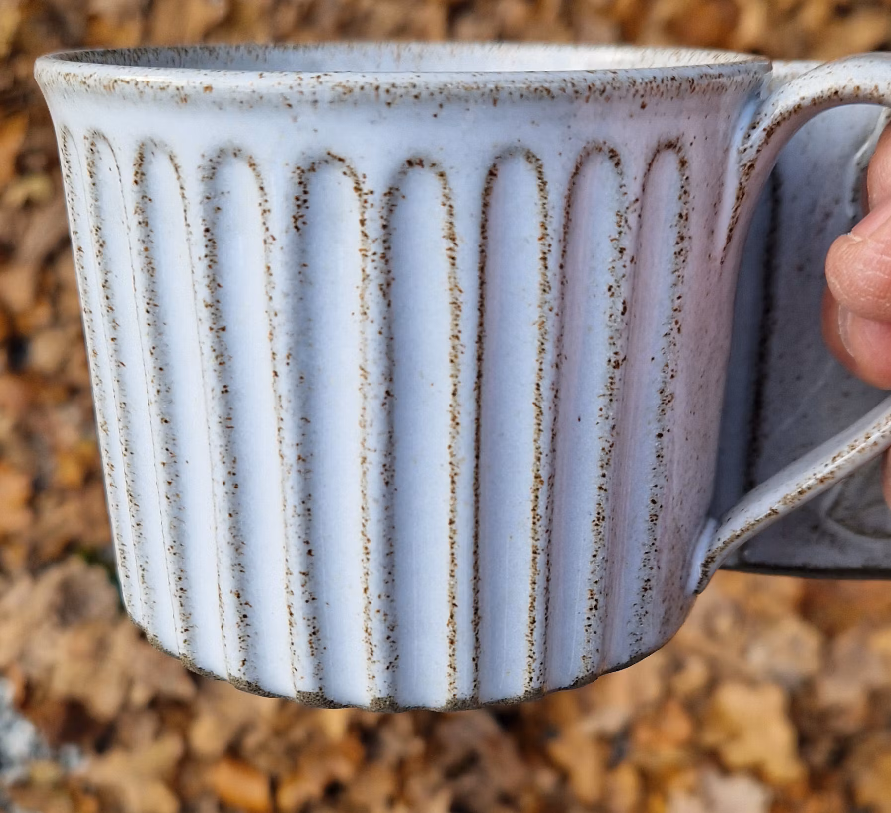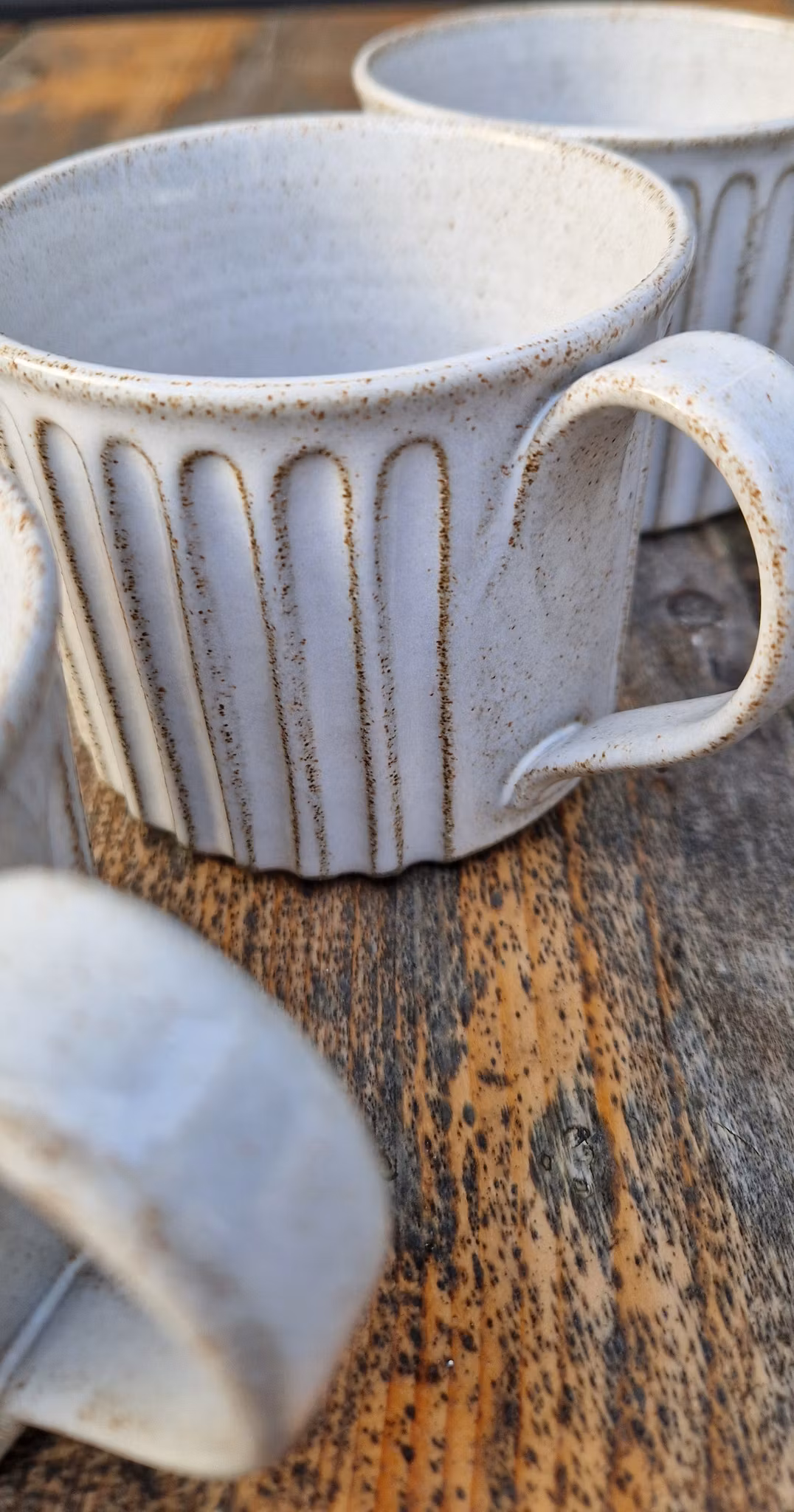 Så har jag namngett den här stengodsserien. Kopparna är drejade och sen urkarvade för att skapa fåror i godset. Glasyren talar så fint med lerans skärv när jag gör olika mönster i leran. Alla koppar är genuina och avvikelser i mönster och färgton kan variera då lera är ett levande material.