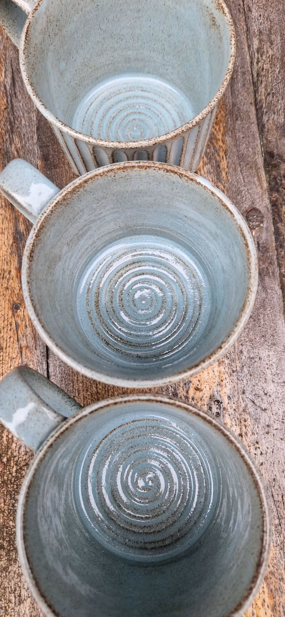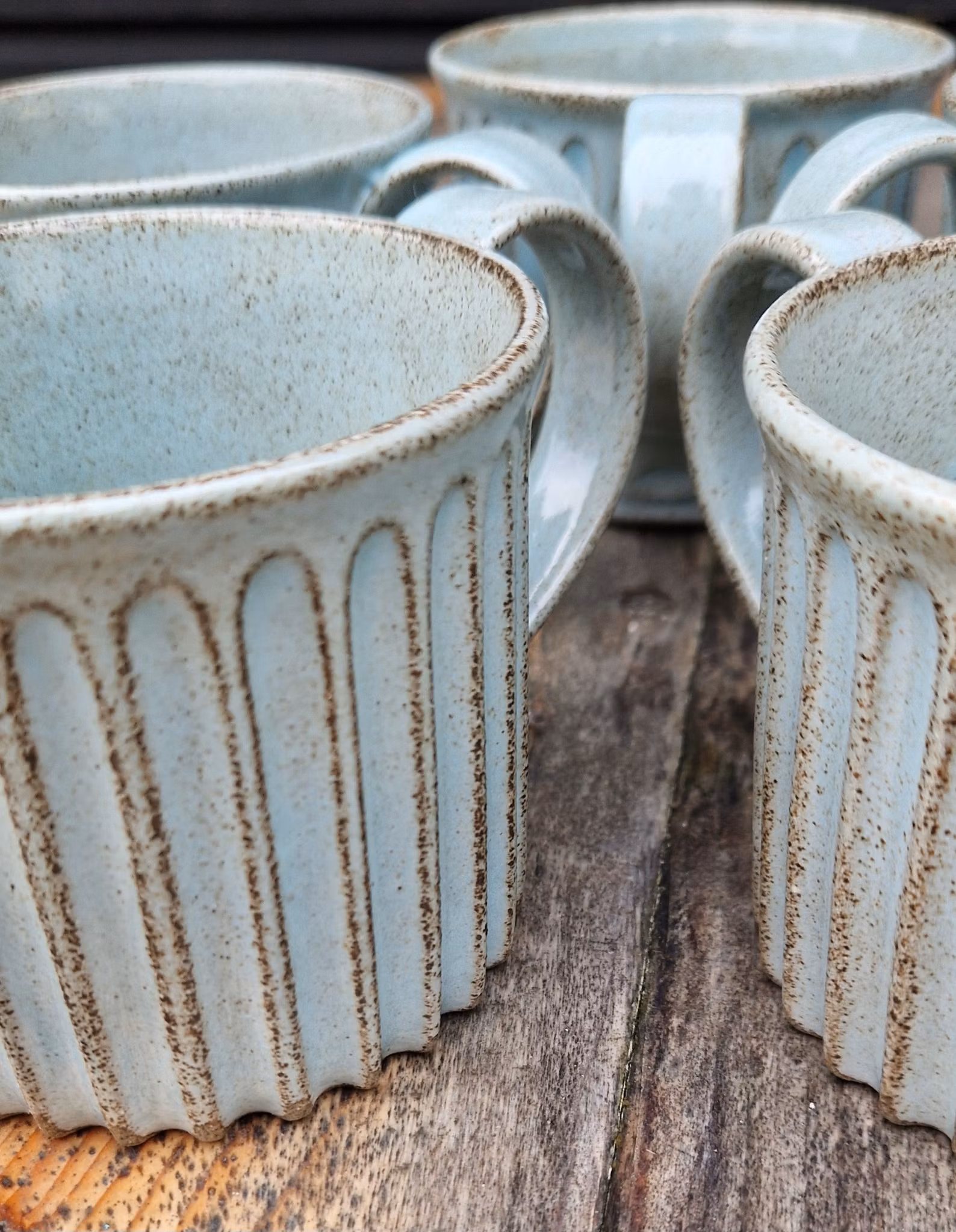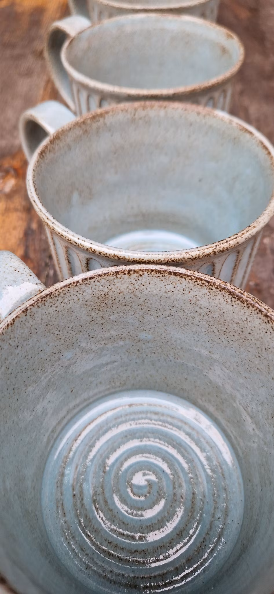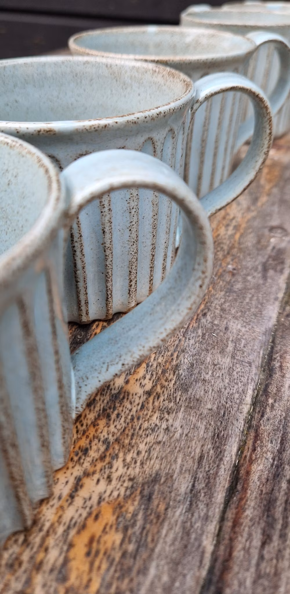 Så har jag namngett den här stengodsserien. Kopparna är drejade och sen karvade för att skapa fåror i godset. Glasyren talar så fint med lerans skärv när jag gör olika mönster i leran. Alla koppar är genuina och avvikelser i mönster och färgton kan variera då lera är ett levande material.