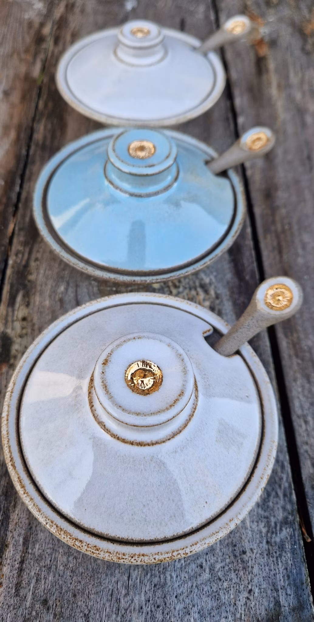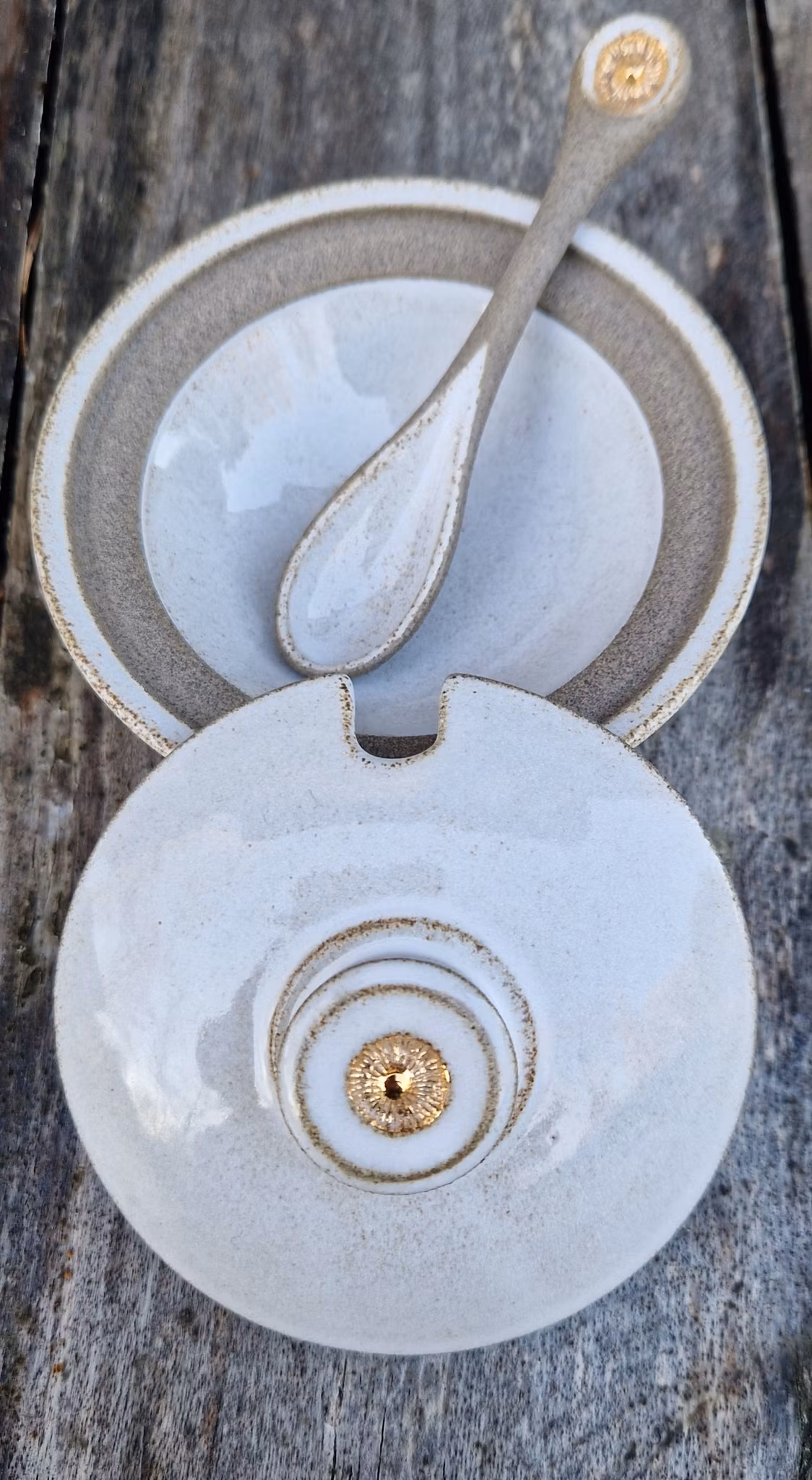 Ett dekorativt litet krus med lock och sked att ha framme på bänken.
