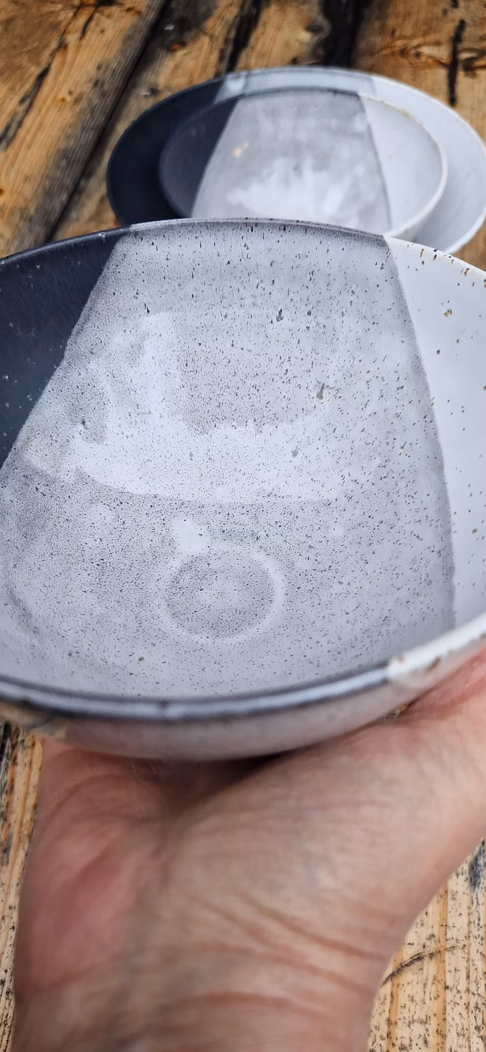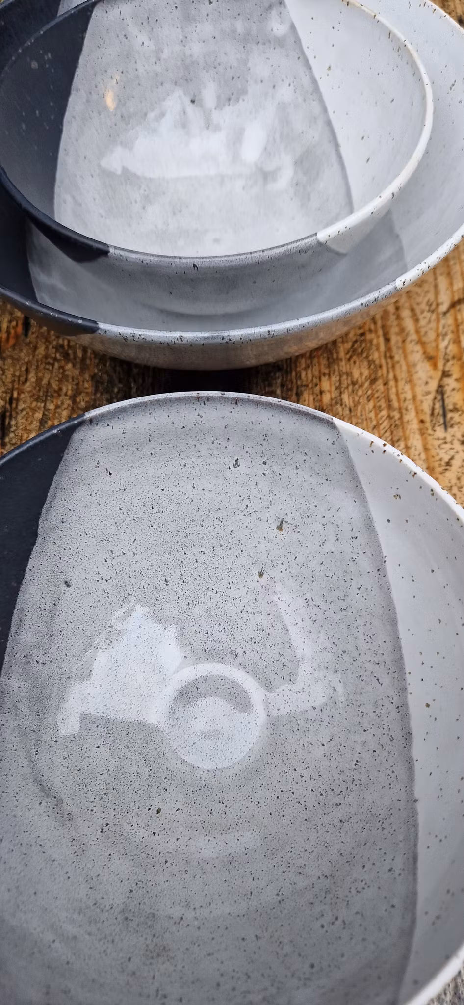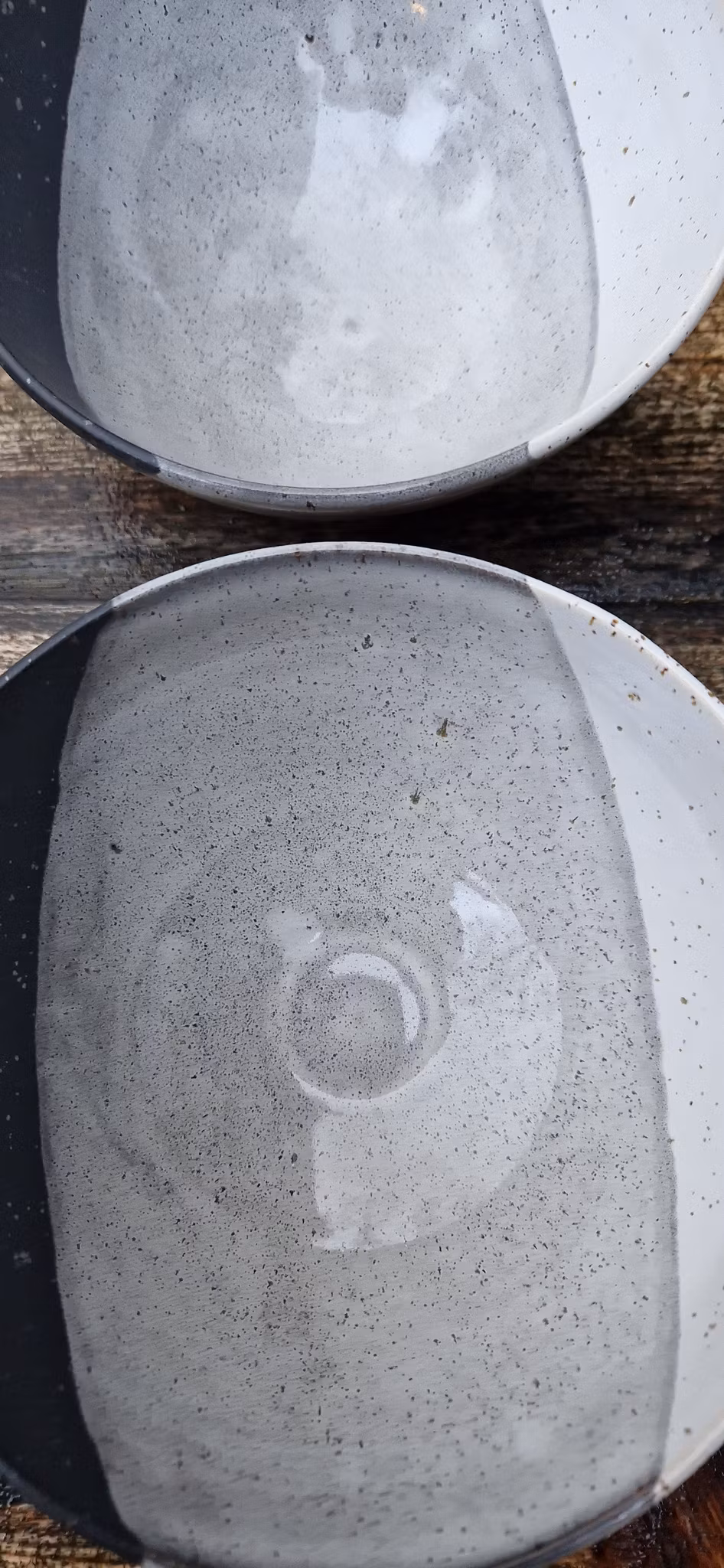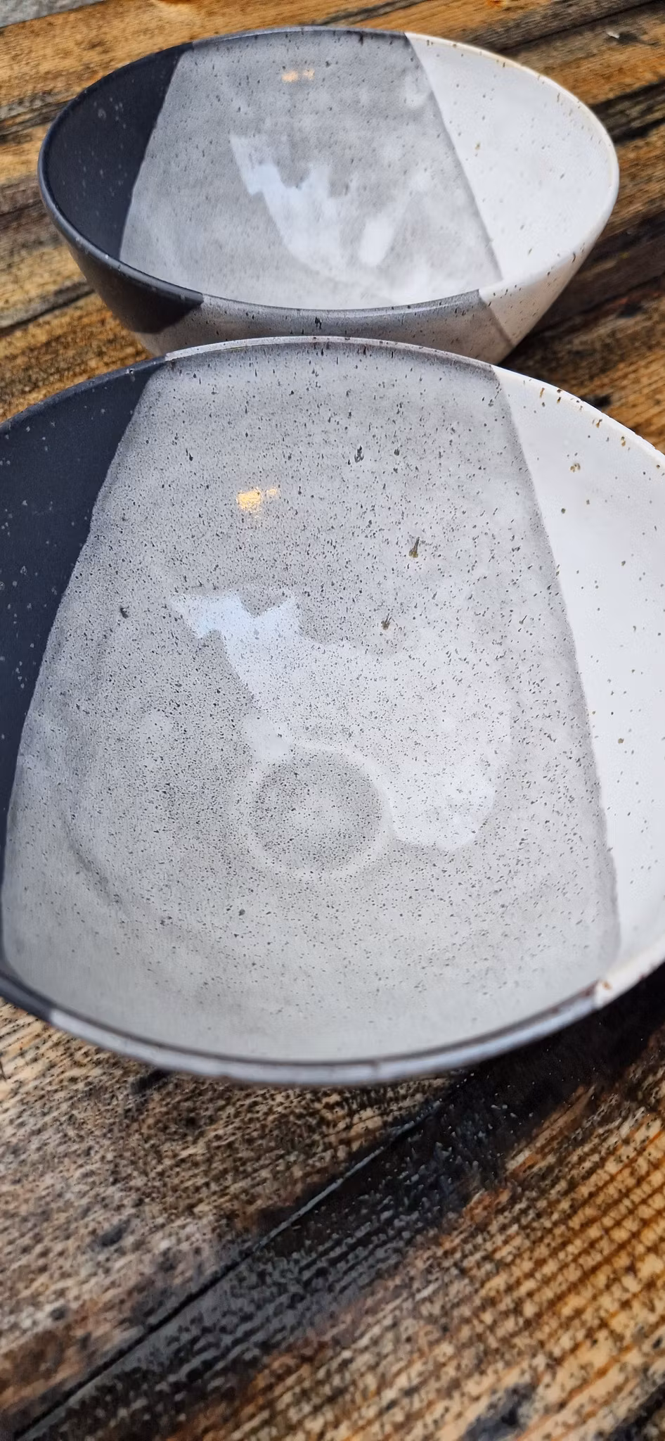 Godset är dubbeldoppat i svart och vit stengodsglasyr och färgerna kan variera.